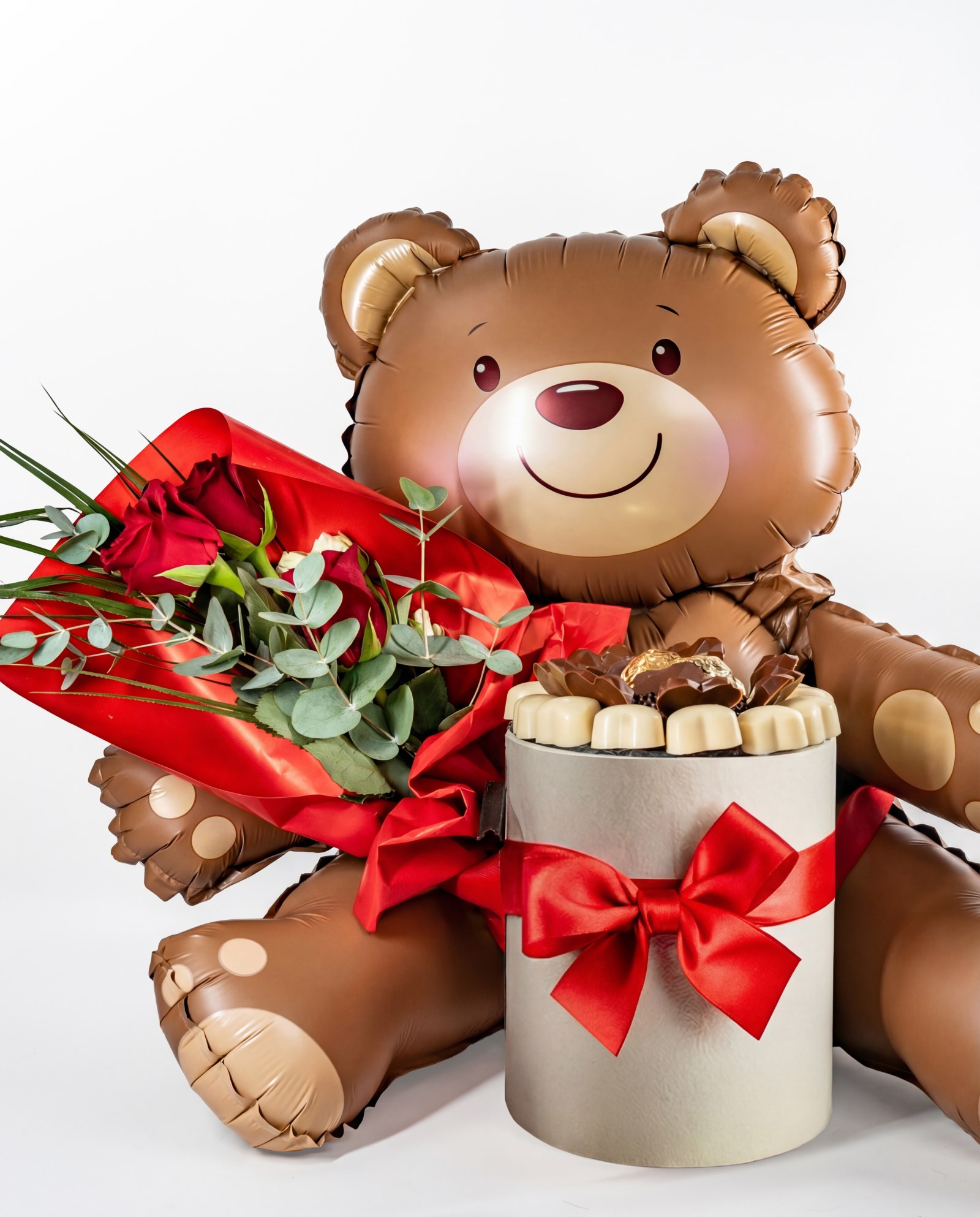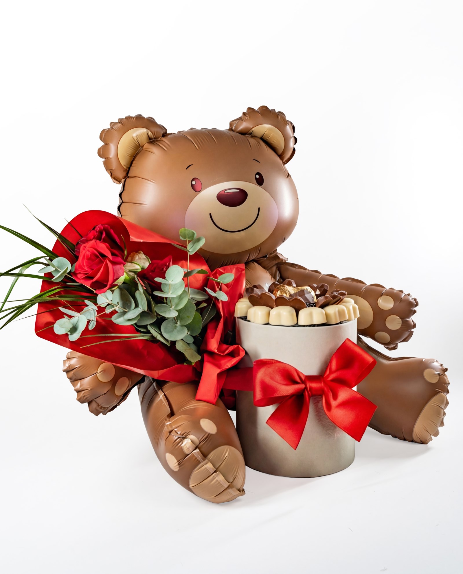 Balon ayıcığın sevimli eşliği, kırmızı güllerin romantik dokunuşu ve çikolata dolu özel kutu…