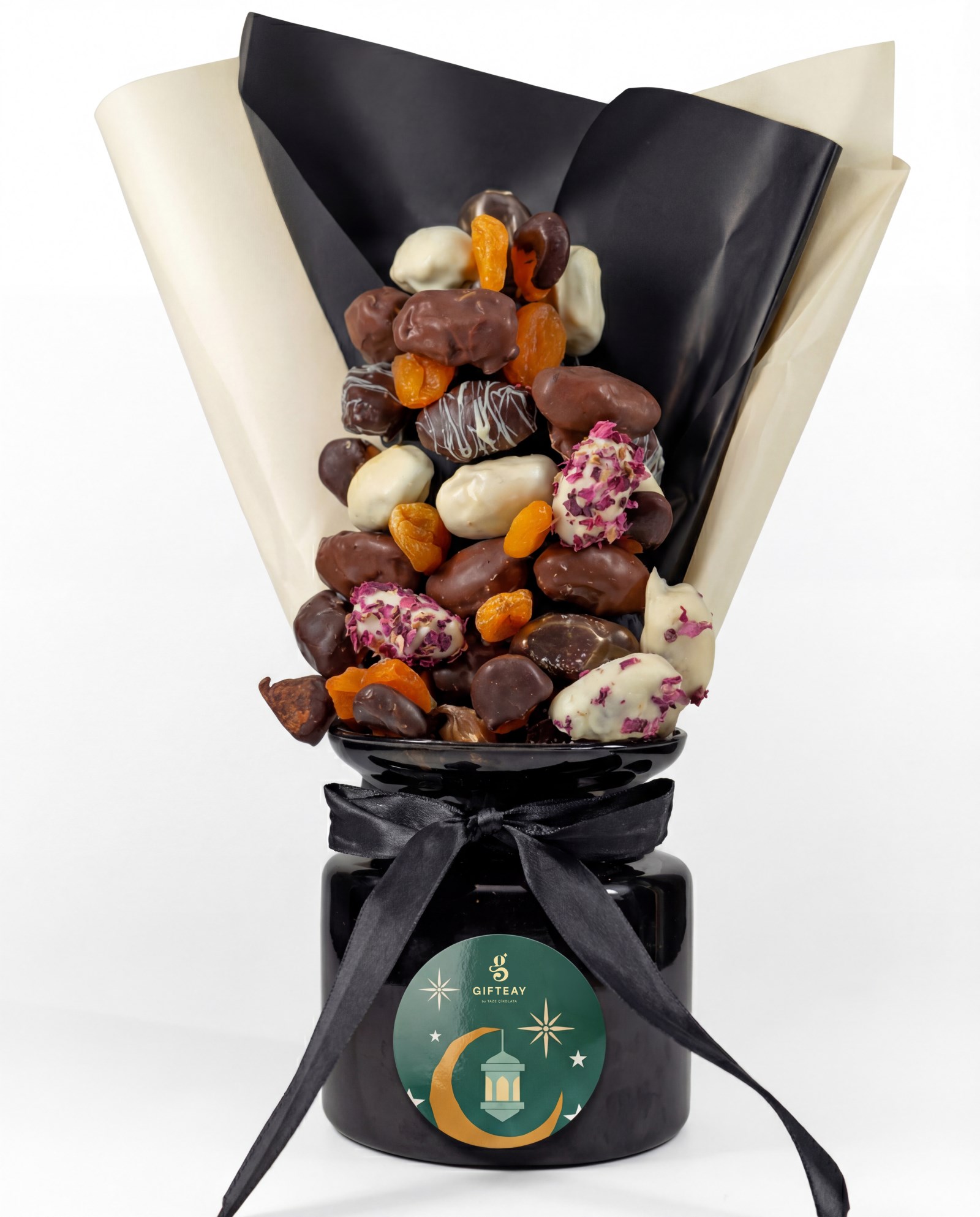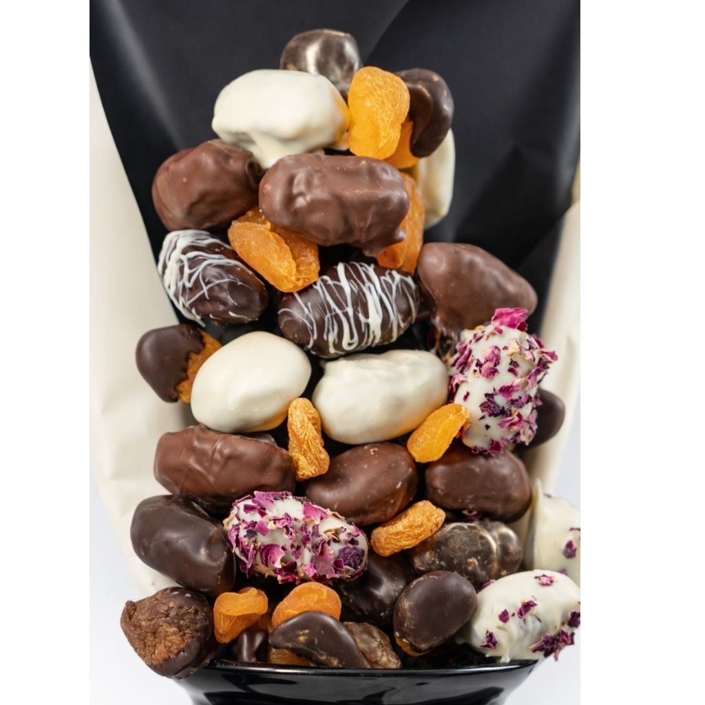 Siyah cam vazo içerisinde sunulan Sahra Esintisi, sütlü, bitter ve beyaz çikolata ile kaplanmış hurmaların yanı sıra çikolata kaplı incir ve kayısılarla hem görsel hem de damakta iz bırakan bir lezzet şöleni sunar.